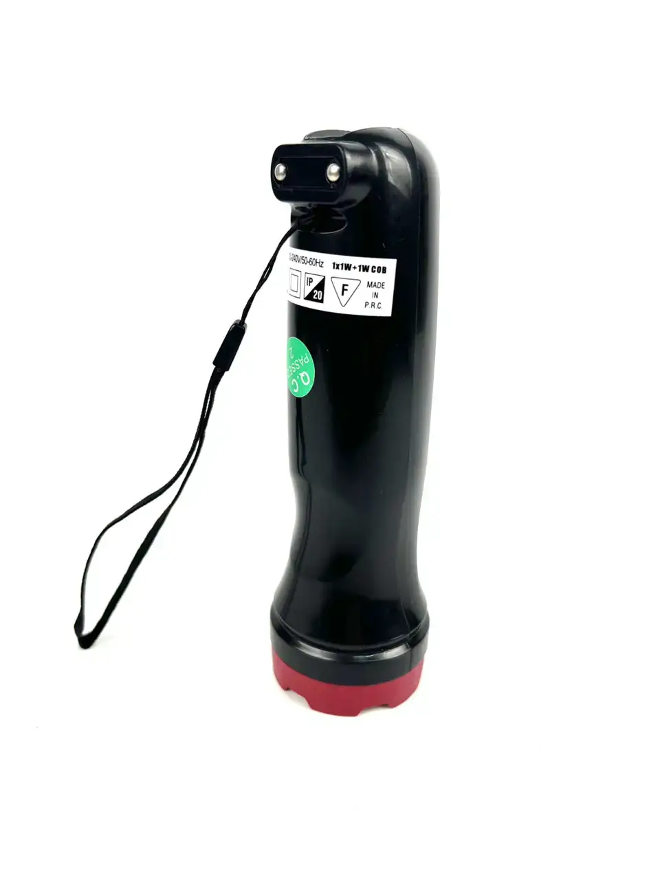Конструкція має висувні «ріжки», за допомогою яких під’єднується до розетки та заряджання. Отже, ліхтар не потребує додаткових дротів і адаптерів.
