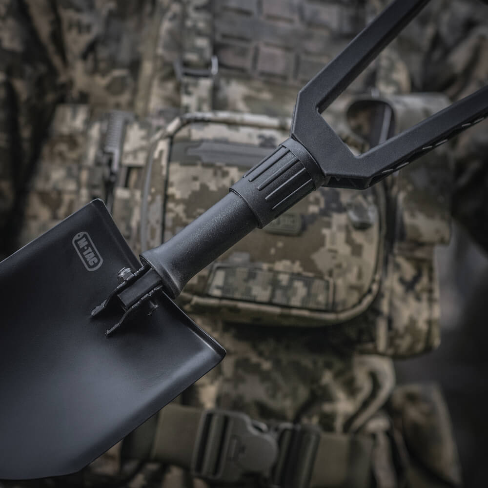 Для туристичних і військових походів потрібним інструментом виявиться складна лопата від виробника М-Тас. Це надійний і практичний інструмент, який з успіхом виконує функції лопати та мотики. Крім стандартного положення, лезо може фіксуватися під кутом 90 і 70 градусів до ручки – в такому вигляді лопата може використовуватися у вигляді совка або кирки.